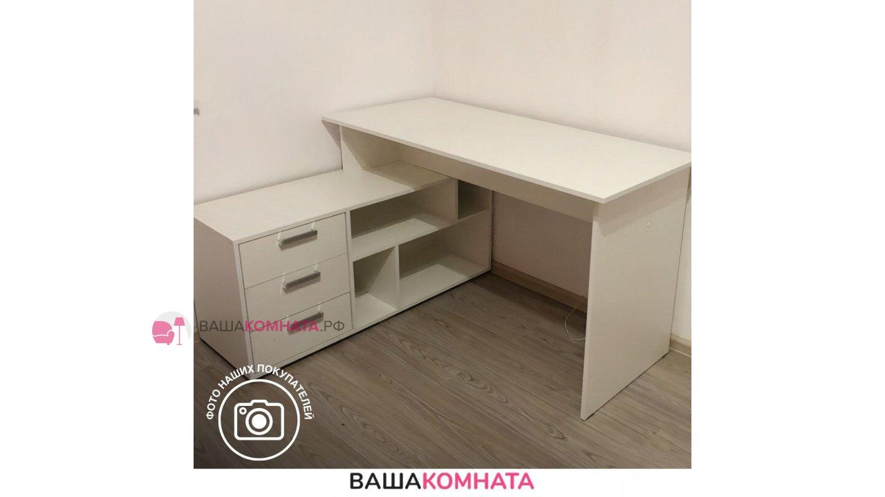 Стол очень вместительный и функциональный, он оснащён широкой столешницей, за которой будет удобно работать с компьютером, ноутбуком или учебными материалами. Также у стола есть боковая тумба, на которой можно дополнительно разместить оргтехнику, декор или книги.