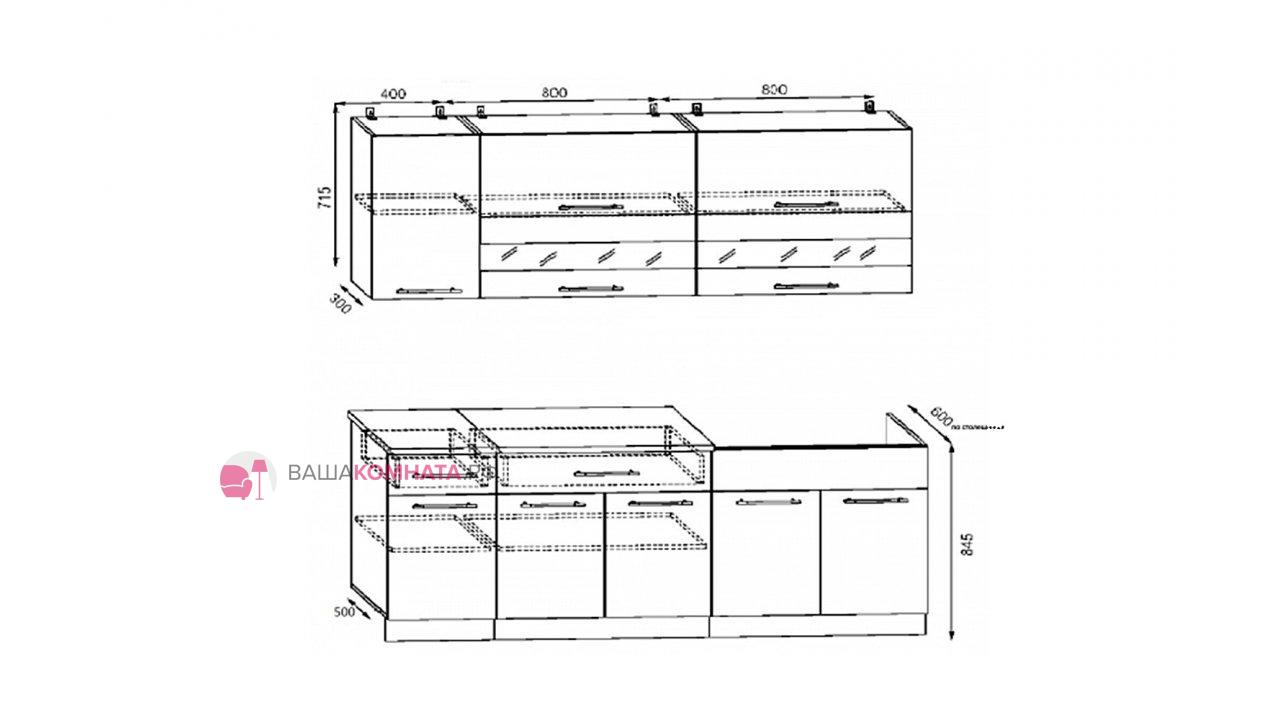 - Верхние модули: ШВ 800, ШВ 800, ШВ 400 (ВхГ) 715х300 мм