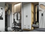 Это двустворчатая модель с распашными дверцами и двумя выдвижными ящиками внизу. Шкаф выполнен в современном стиле и имеет габаритные размеры. Доступная цена делает модель еще привлекательнее.